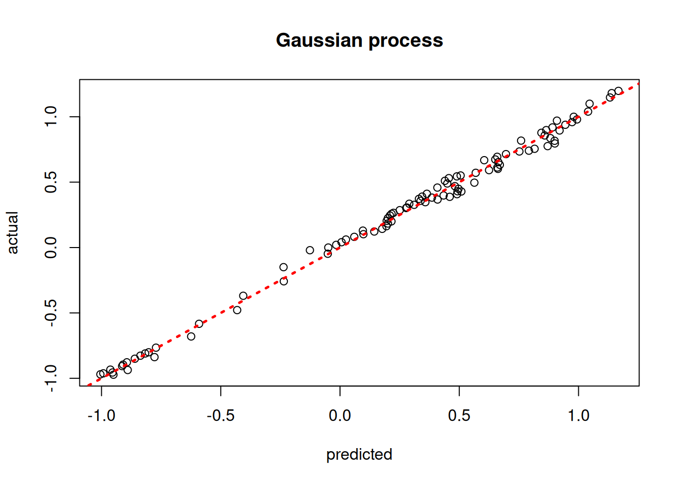 plot(model_gp$ZZ.mean, y_test, xlab = "predicted", ylab = "actual", main = "Gaussian process")