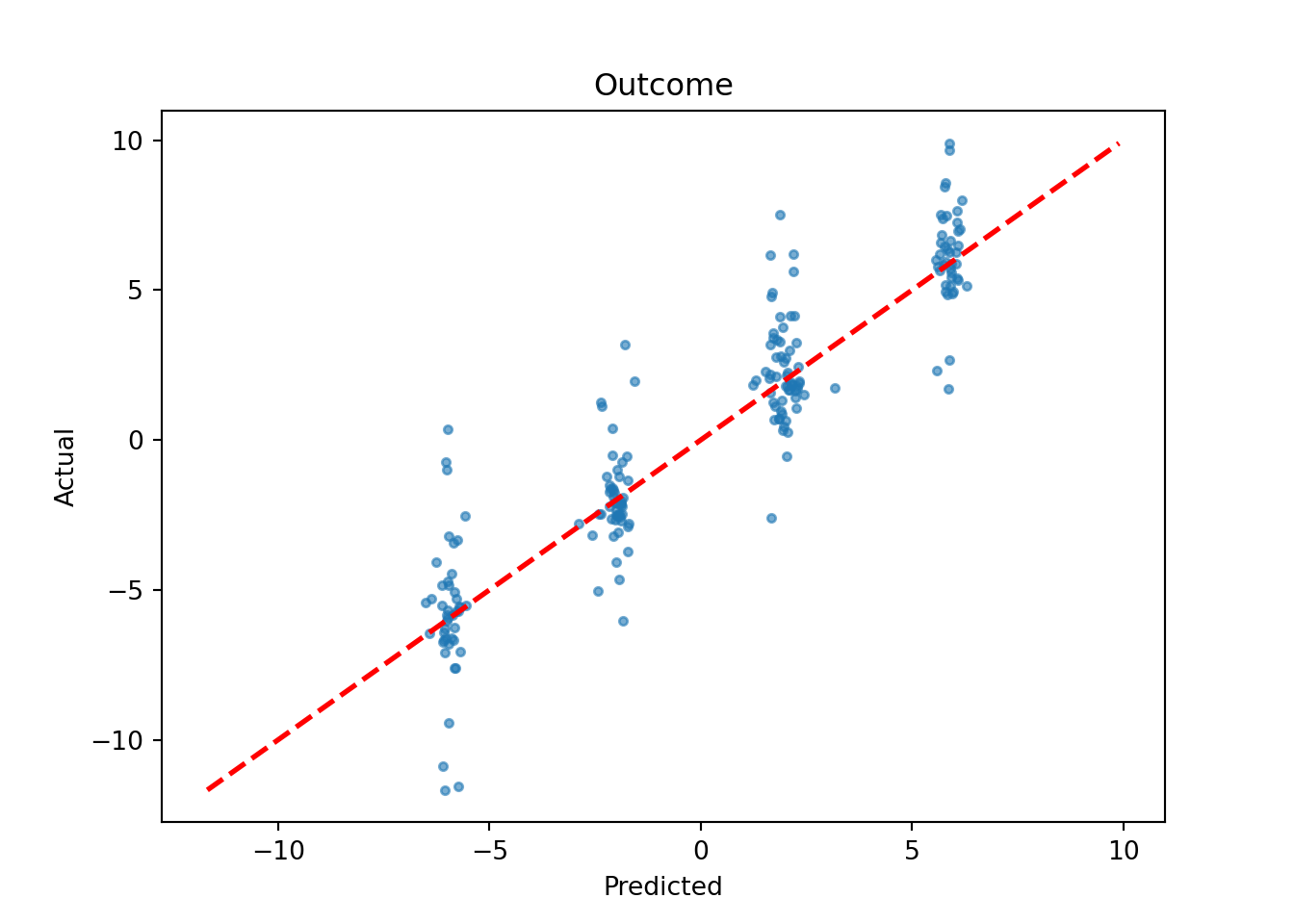 We also plot the true outcome against mean forest predictions