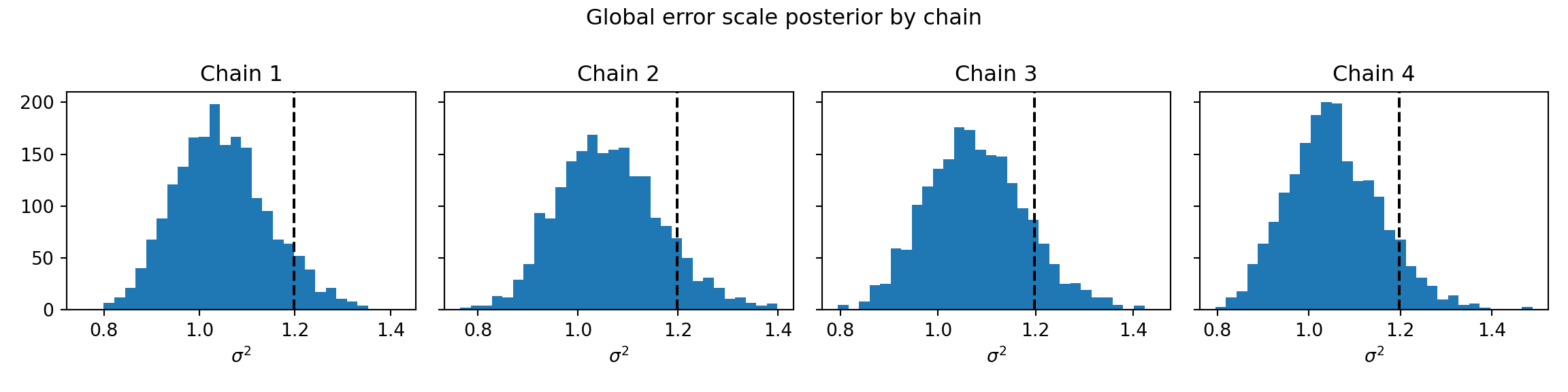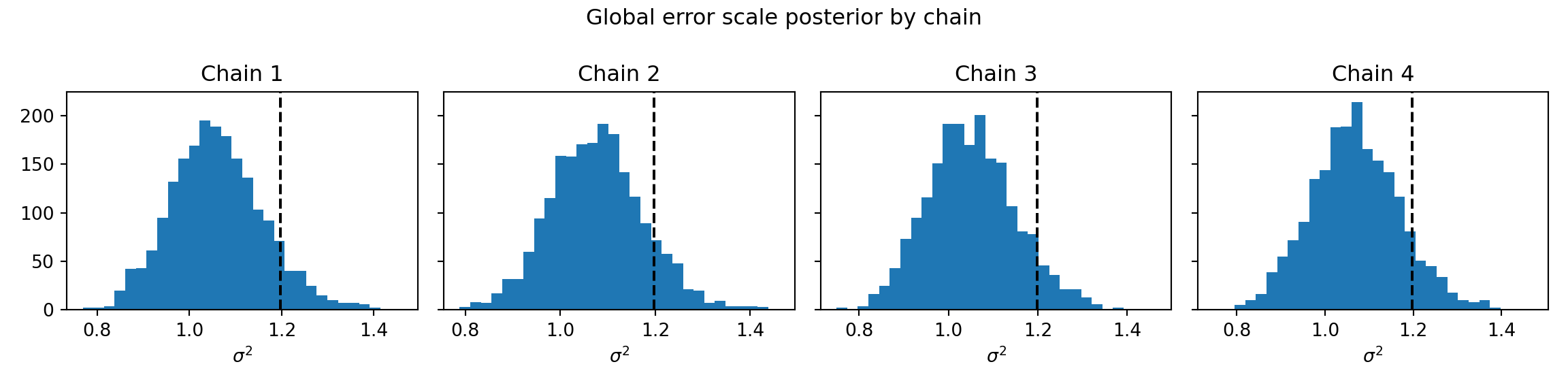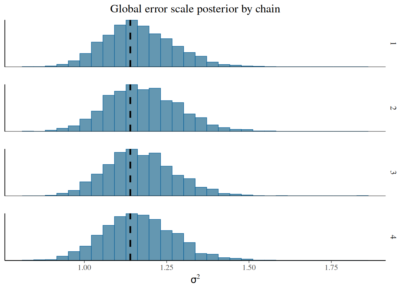 )sigma2_chains = bart_model.global_var_samples.reshape(num_chains, num_mcmc)bayesplot::mcmc_hist_by_chain(