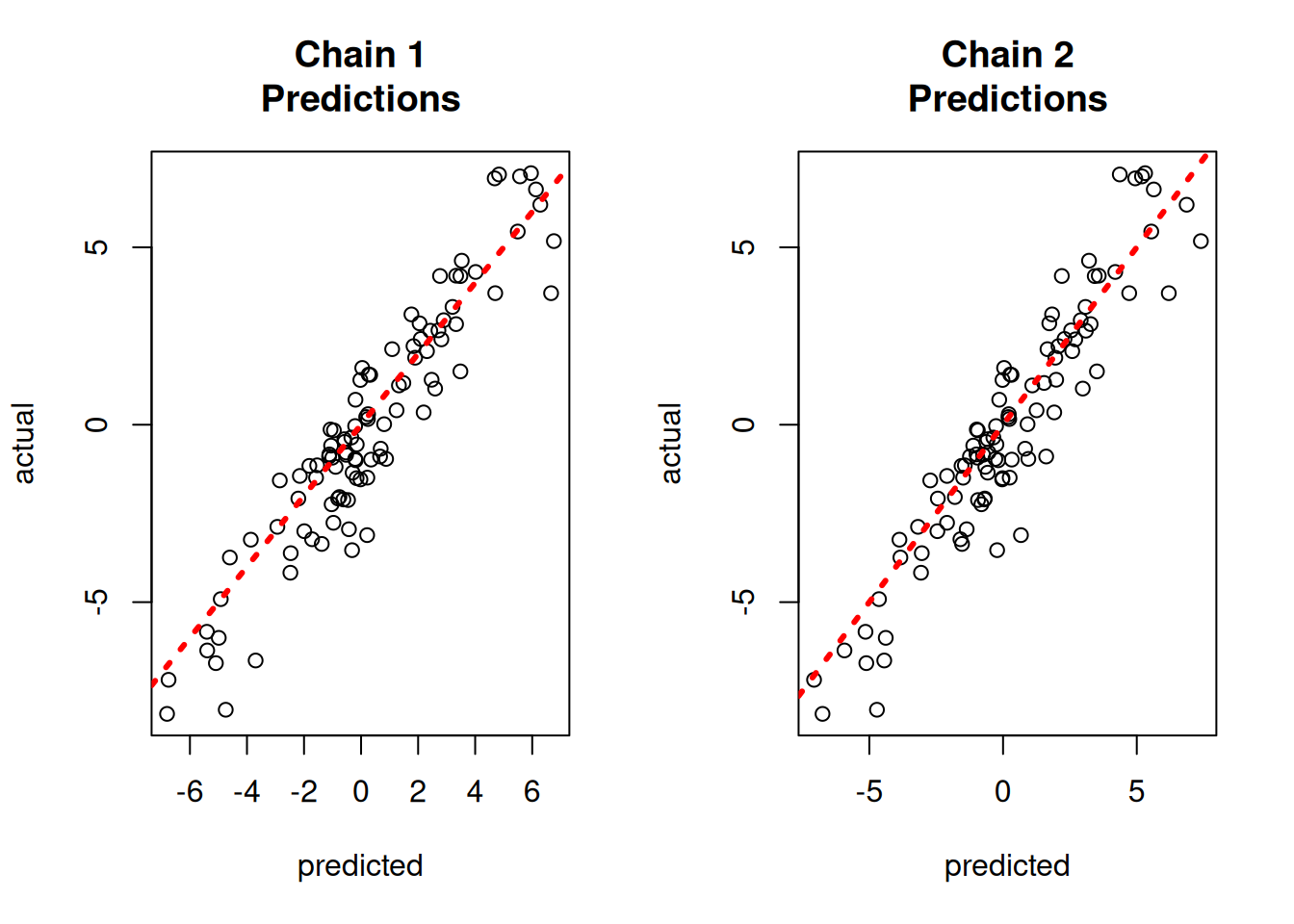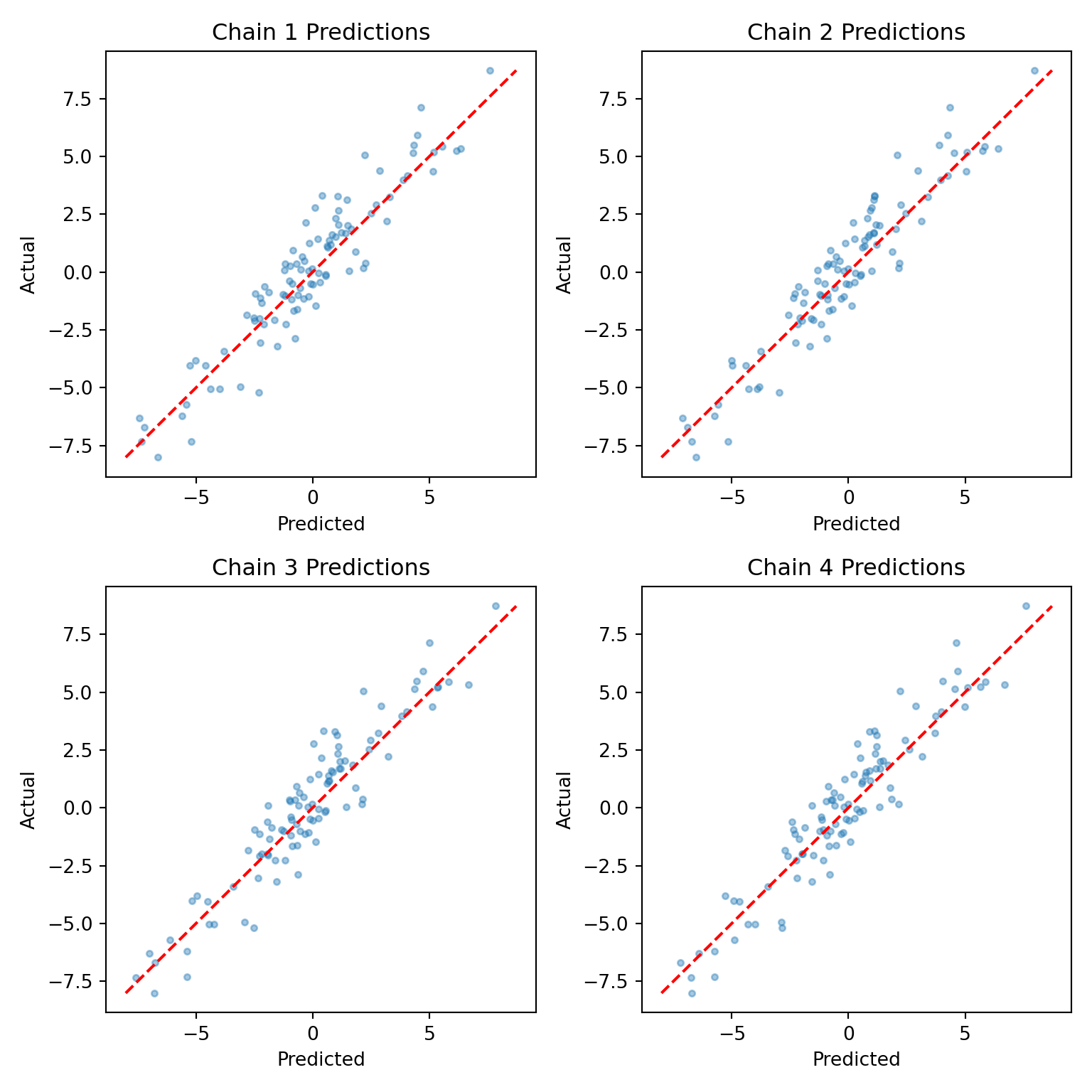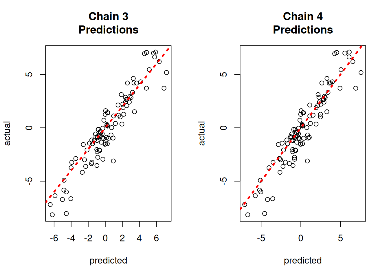 Since each chain is a set of samples of the same model, we can analyze the samples collectively, for example, by looking at out-of-sample predictions.