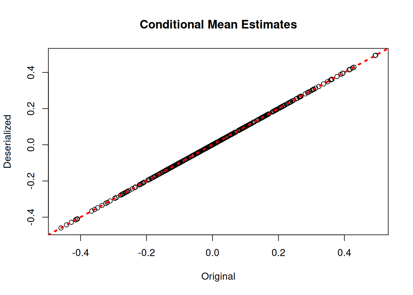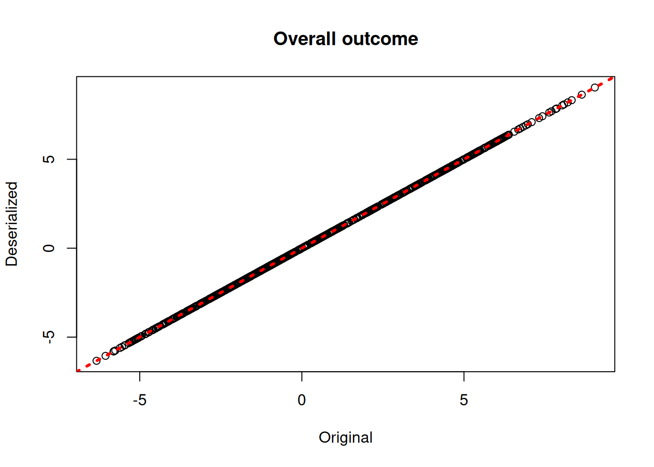 xlab = "Original", ylab = "Deserialized", main = "Overall outcome")