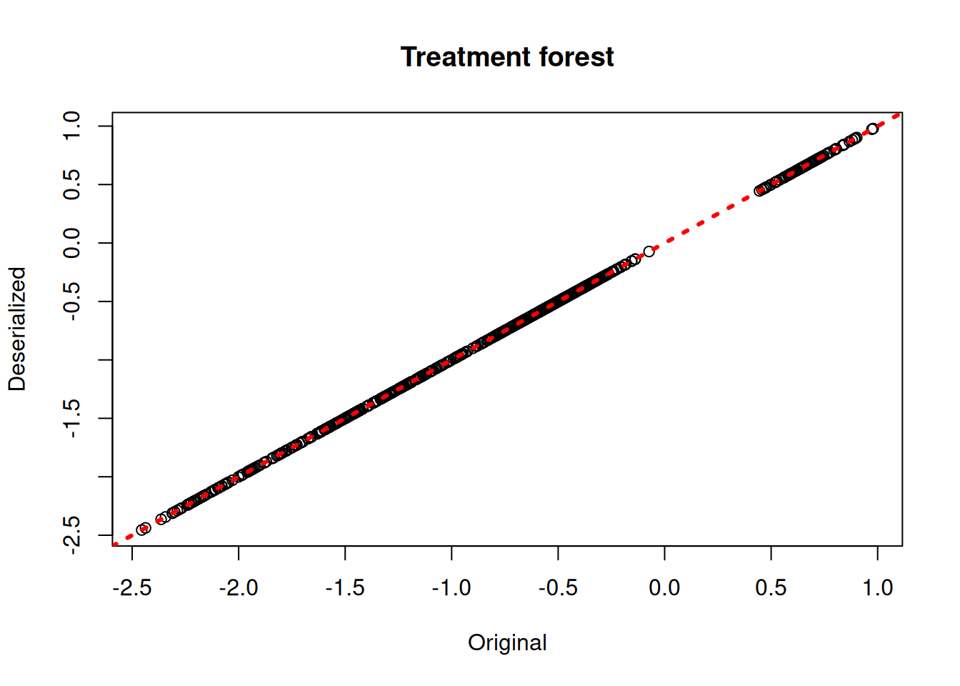 xlab = "Original", ylab = "Deserialized", main = "Treatment forest")
