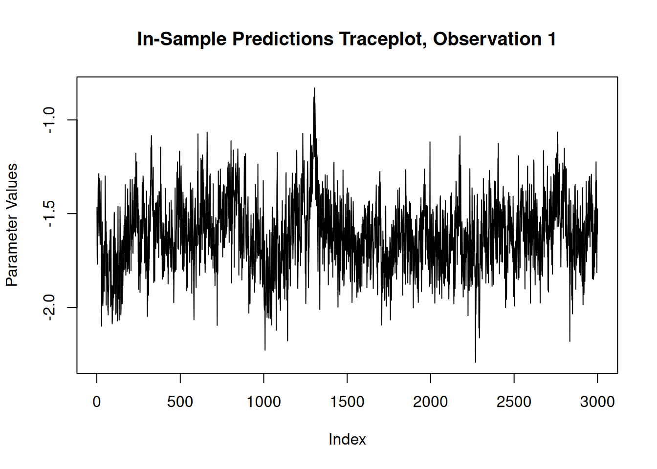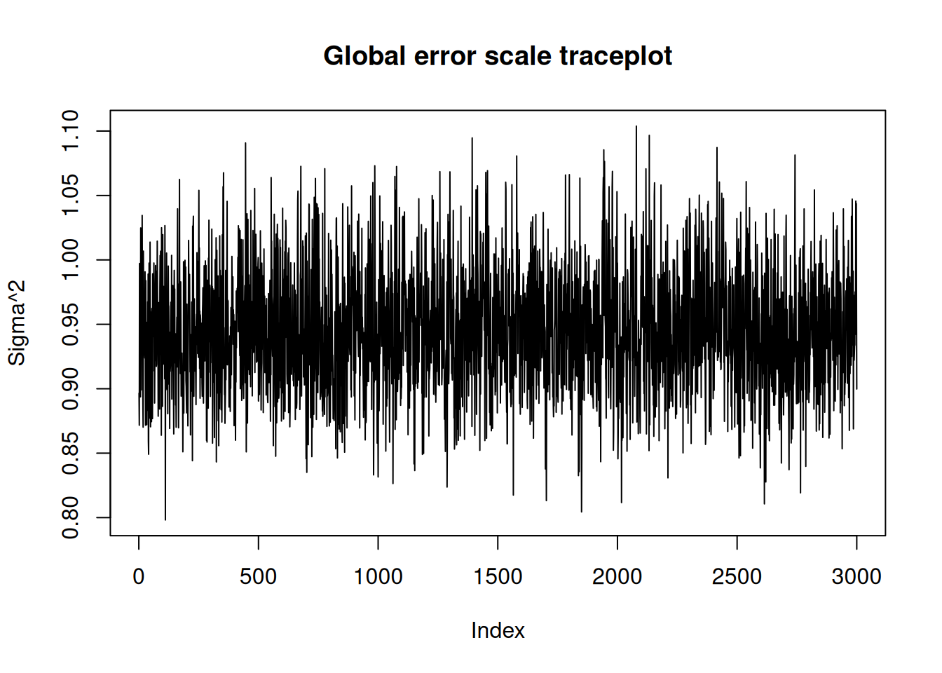 In R, we have a plot() that produces a traceplot of model terms like the global error scale \(\sigma^2\) or (if \(\sigma^2\) is not sampled) the first observation of cached train set predictions.